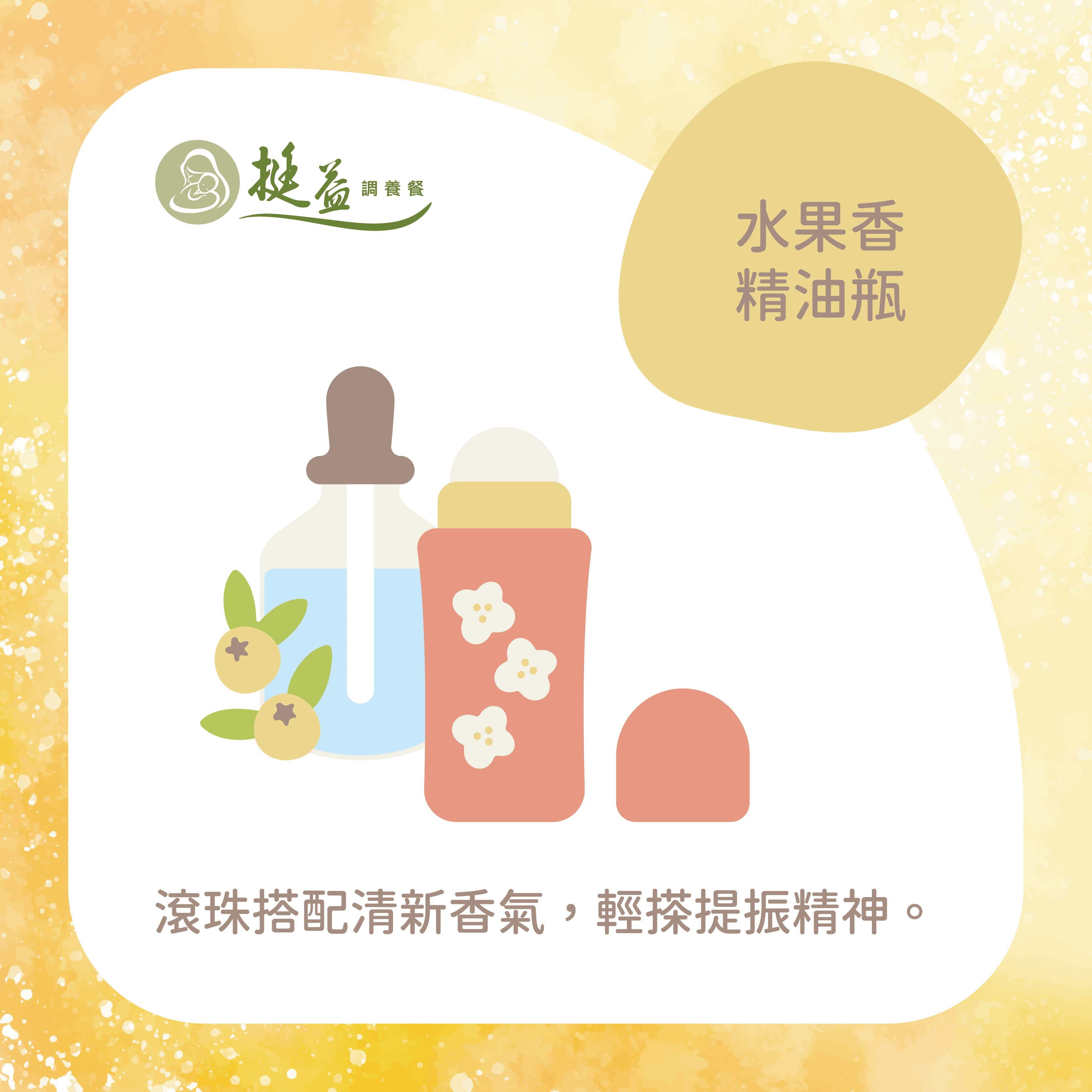水果香精油瓶:迷你滾珠裝,柑橘或薄荷清新香氣,輕搽手腕提振精神