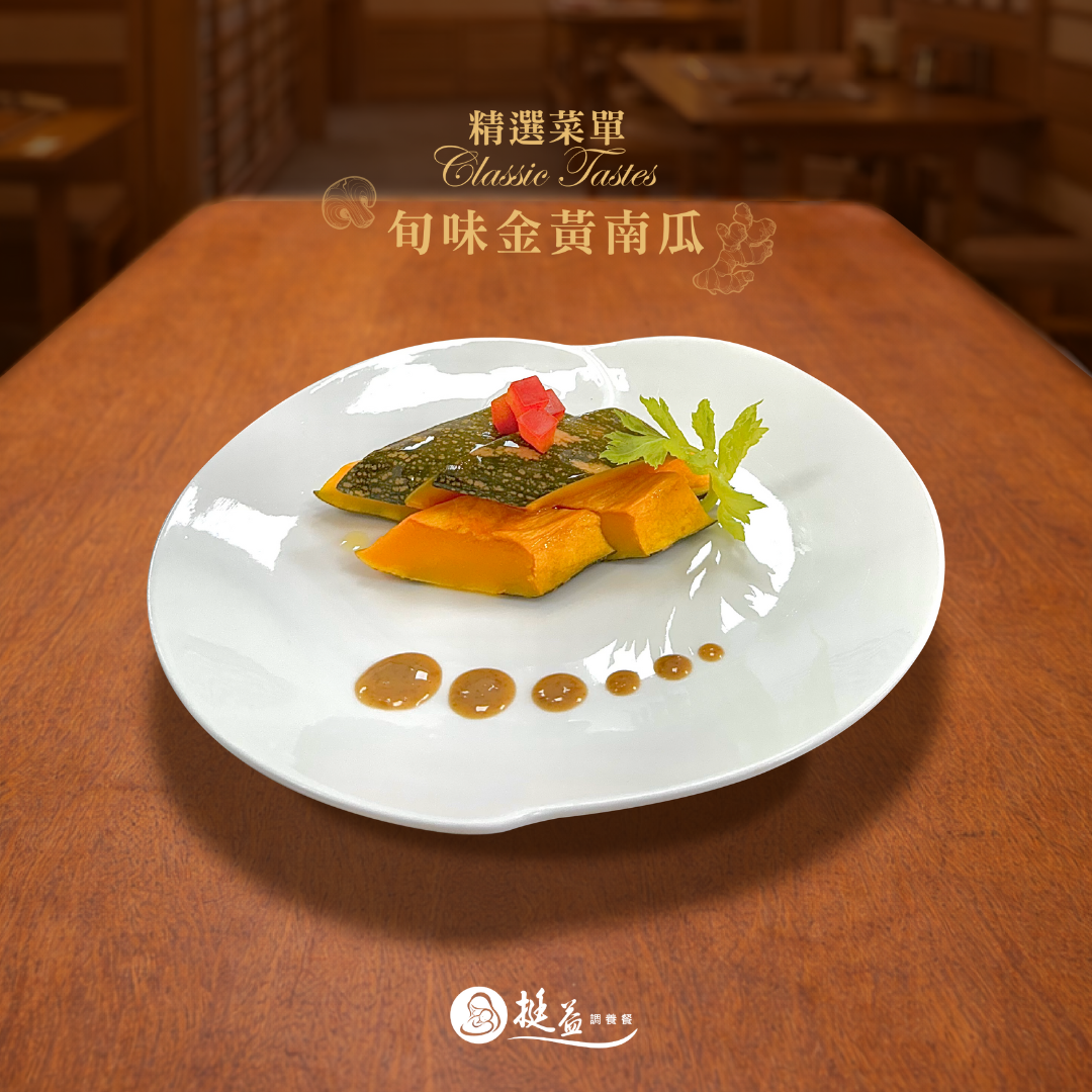 嚴選當令南瓜慢火烹調,自然甘甜、口感綿密,呈現季節蔬食的純粹美味。